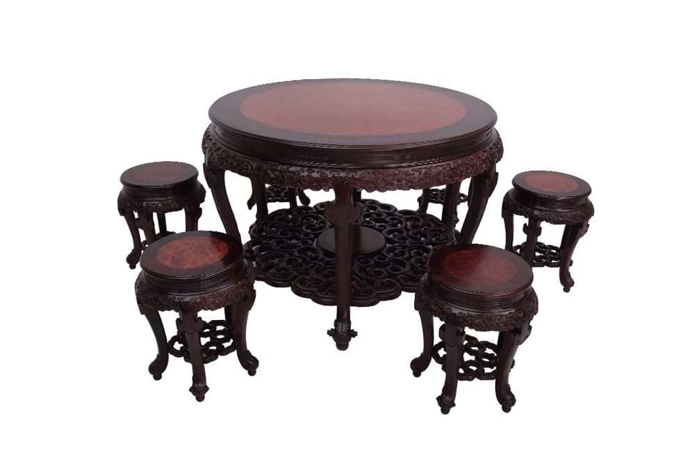 大紅酸枝+癭木 圓桌:81X81X80 凳子:33.5X33.5X48.5