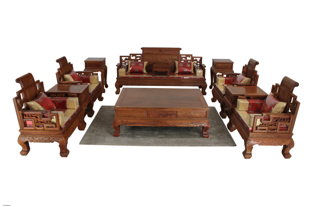 緬甸花梨 三人椅:215X63X106 大平幾:148X108X52 茶幾:63X53X64 花幾:45X45X81 單人椅:92X63X106